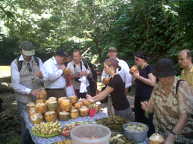 Makanannya? Nasi yang dibungkus daun, daging payau yang seperti dioseng, lalapan batang bambu muda yang bisa dikunyah karena lembut nan renyah, sayur daun pepaya muda, sayur jamur dicampur darah/getah pohon hutan, ikan duri lunak ala, kerupuk tepung beras, dll. Agak aneh di lidah, namun secara umum OK. Minuman pembuka adalah air kelapa gading yang dihisap menggunakan sedotan batang bambu. Sungguh alami dan eksotis.